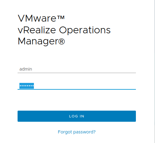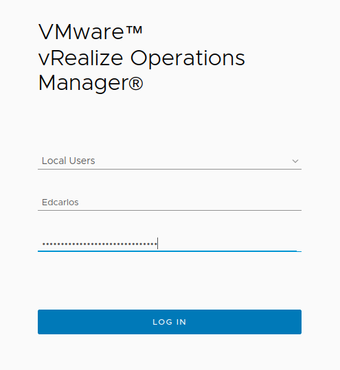 Você precisa fazer login na página de administração do vROPS usando suas credenciais de administrador, conforme indicado abaixo: