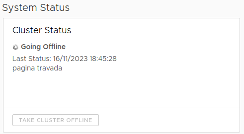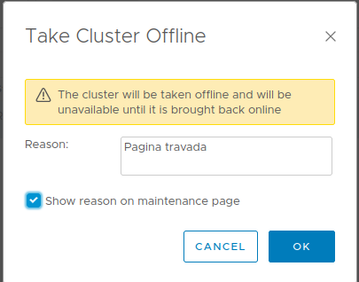 Depois de fazer login, coloque o cluster offline. Observe que isso colocará todo o seu cluster vrops off-line.