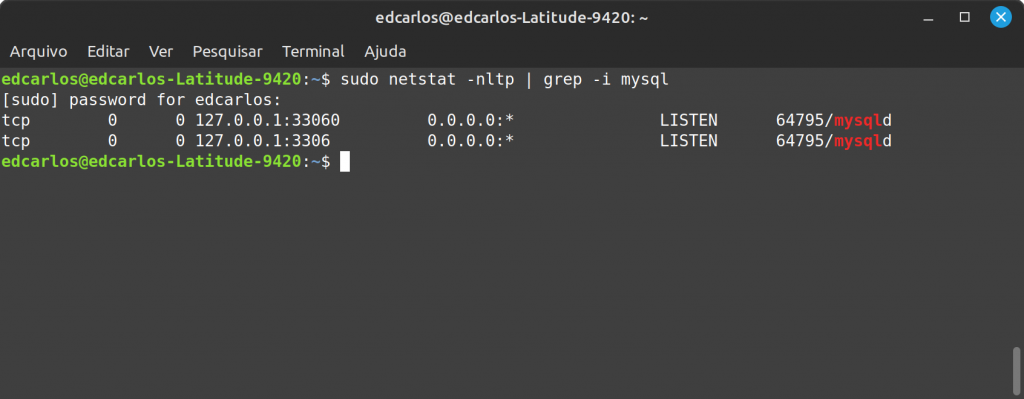 Quando o servidor MySQL está em execução, ele abre a porta 3306 para comunicação por padrão. Isso pode ser verificado com o comando netstat.