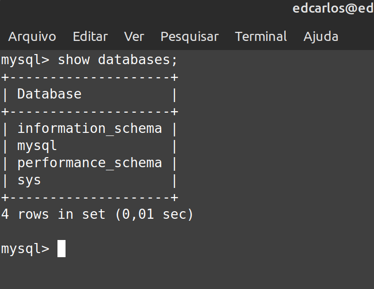 Depois de entrar no console do MySQL, você pode executar comandos SQL. Lembre-se de que cada comando precisa terminar com ‘;’ (ponto e vírgula).